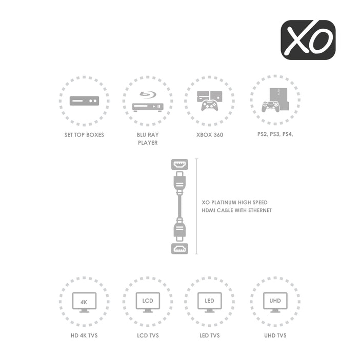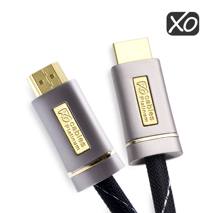 Optimal signal transfer is the basis for the brilliant HD picture quality - this high-end cable is a guarantee for it. One of the most durable cables on the market, the XO Platinum High-speed HDMI cables have been designed in Oxford to meet the high bandwidth performance standards set by HDMI Version 1.4, 2.0 (2.0a & 2.0b) and 2.1. Featuring a nylon braiding which gives it a snakeskin-like look, adding to the aesthetic appeal of our product, acting as a protective shield, this cable has an innovative stress-relief function, allowing it to bend with minimum stress when connected vertically or horizontally, without losing the signal or breaking easily. Double shielded and protected against interference while maintaining its flexibility, this cable features 24k gold plated connectors, eliminating the signal loss and the noise.