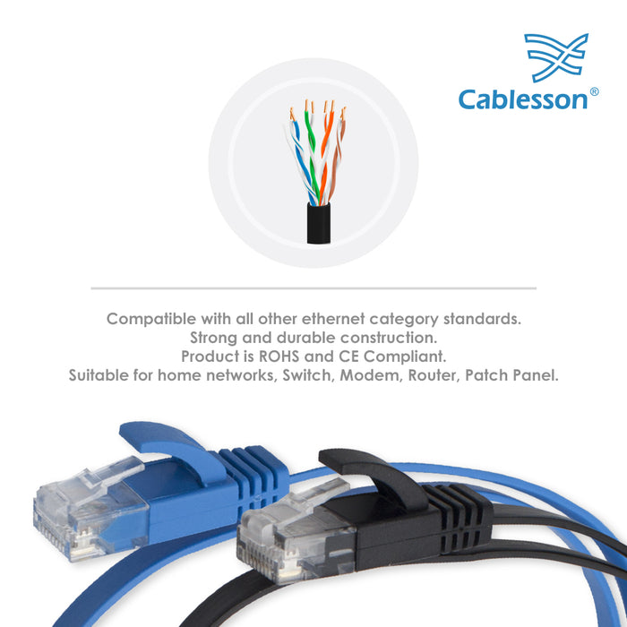 Cablesson came into existence in the world renowned city of Oxford United Kingdom and is led by a team of young tech-loving and innovative individuals. We are premier manufacturers of high-quality HIGH DEFINITION cables components and accessories for consumer electronics products. As a result, we continuously strive to give you the best combination of a valuable product and impeccable customer service. The high-quality Cablesson Cat6 Flat network cable is perfectly suited for 10/100/1000 MBit Ethernet networks in office buildings and private households whether you want to connect your PC notebook games console or even other devices to the internet or in the network. This is easily possible with this high-performance Cat6 flat Patch cable. The Cat6 Patch cable is suitable for any DSL speed and is able to connect all devices with network capability quickly and easily. Compatible with all other ethernet category standards. Strong and durable construction. color: Black and Blue Flexible and easy to work with flat Cat6 cable. suitable for home networks Switch Modem Router PatchPannel.