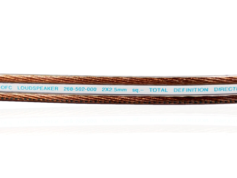 Van Damme UP-LCOFC Hi-Fi Speaker Cable 2 x 2.50mm twin-axial type overall cable diameter: 12.00x4.00mm. Conductor Resistance 7.40 Ohm/Km conductor stranding 7 x (46x0.10mm) weight 90 kg/km. Part number: 268-502-000.Applications: high end domestic Hi-Fi professional studio near field monitoring.