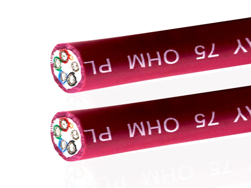 Tinned oxygen free copper conductors for high efficiency signal transmission flexible PVC composite Purple Red jacket - RAL 3004. Industry standard colour coded (Red Green Blue Black White) coax colours.
