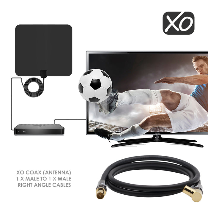 The XO Coax (Antenna) 1 x Male to 1 x Male Right Angle Cables are for televisions, DVB-Ts or DVB-C receivers. This shielded cable is better protected against electromagnetic disturbances than standard cables. The extra sheath current on the cables passed between the television and receiver/antenna socket is minimised by the protection and shielding of the cable. This significantly reduces image distortions such as coloured horizontal stripes. The tv antenna cables can also be used as a high quality extension.