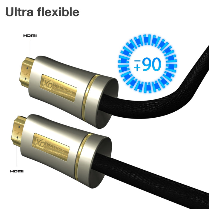 The XO Platinum High Speed HDMI range of HDMI cables have been designed to meet the high bandwidth performance standards set by HDMI Version 1.4 2.0 (2.0a & 2.0b) and 2.1. The nylon braiding gives it a snakeskin-like look adding to the aesthetic appeal of our product and more importantly acts protective. The highly advanced design of this cable incorporates a special stress relief mechanism that permits the cable to bend with minimum stress on the HDMI port when connected horizontally or vertically. Backward compatible and delivers Up to 4k Digital Ultra HD Signal. ARC cable and 3D Compatible.